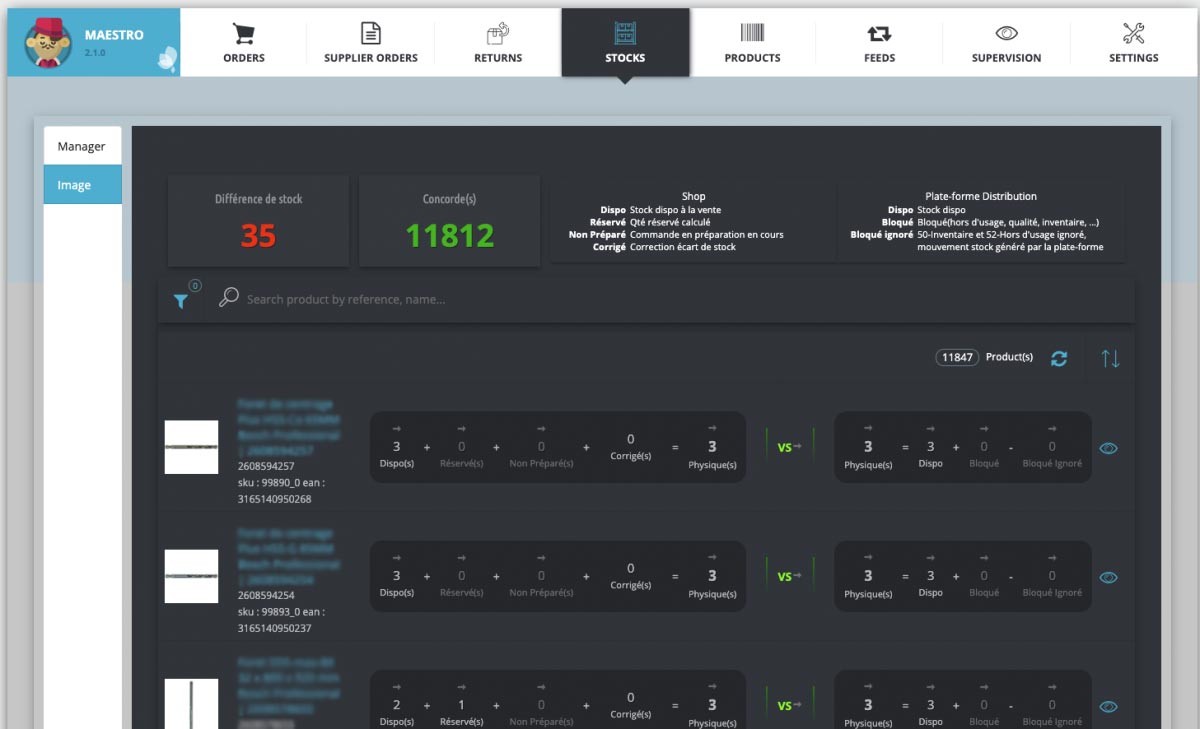 - Gestion de la base produits (synchronisation avec la plateforme de distrib)