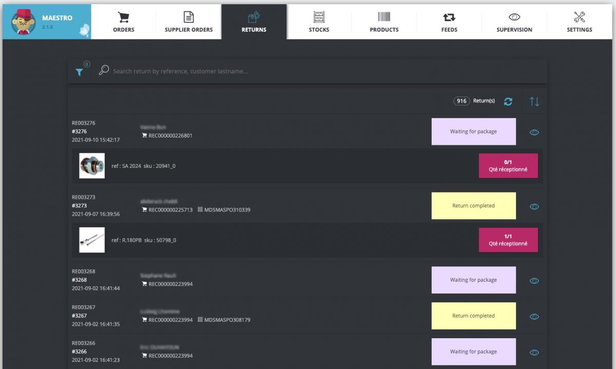 - Gestion des retours produits clients (suivi temps réel des retours)
